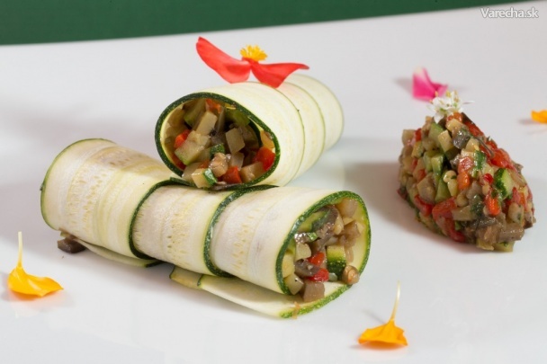 Druhú umytú cuketu narežeme na tenké plátky a poukladáme na fóliu. Posolíme a počkáme 2 minúty, kým cuketa nezmäkne. Naplníme minirattatouille a pomocou fólie zrolujeme.
